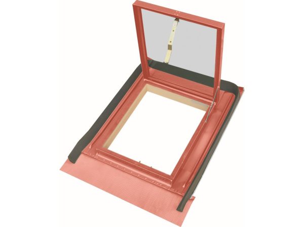 Klasszikus téglavörös színű Optilook (WGI) tetőkibúvó 46x55 cm-es méretben. Szimpla edzett üvegezéssel és beépített univerzális burkolókerettel fűtetlen padlásterekhez.